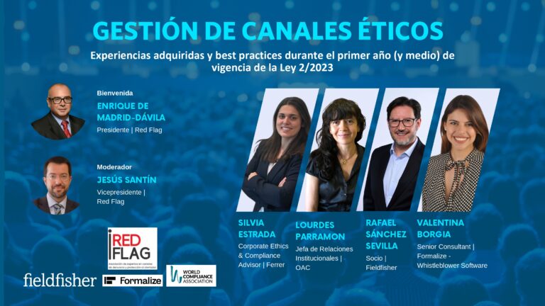 Eventos Desde RED FLAG organizamos encuentros con autoridades y otras entidades, y organizamos actos para fomentar la sensibilización, formación e intercambio de ideas en materia de canales de denuncia e investigaciones internas. Jornada protocolo acoso Jornada sobre canales éticos Presentación libro Encuentro en el Parlamento Jornada Ley 2/2023